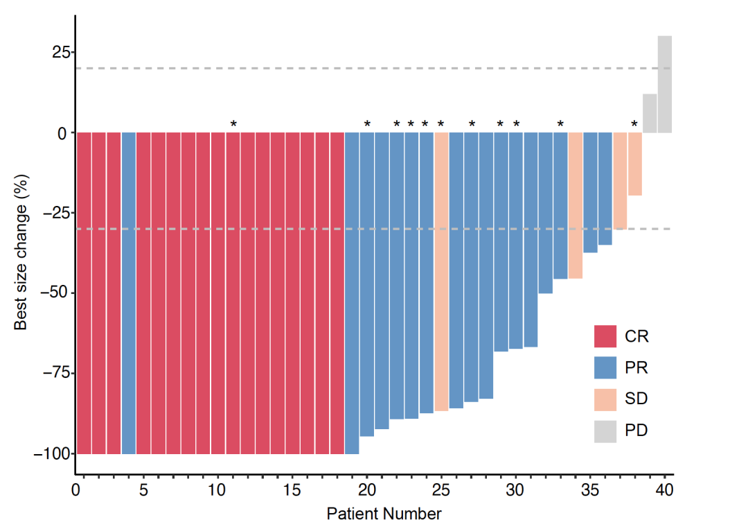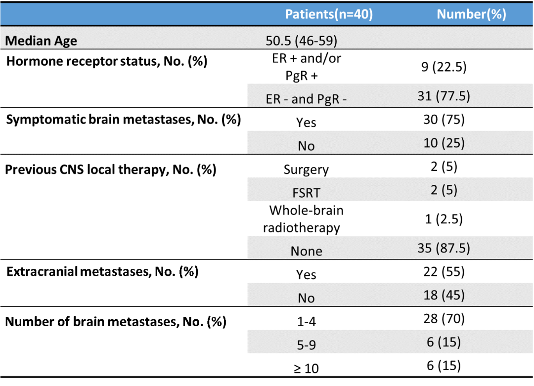 從2020年(nian)1月(yue)-2022年(nian)8月(yue),研究共入組40例患(huan)(huan)(huan)者,包括3例安全導入期的(de)患(huan)(huan)(huan)者。截至2023年(nian)2月(yue)1日,中位隨訪時間17.3個月(yue)(IQR 10.3-26.9)。入組患(huan)(huan)(huan)者中位年(nian)齡(ling)50.5歲;30例患(huan)(huan)(huan)者(75%)基線時存在神經系統(tong)癥狀;21例患(huan)(huan)(huan)者(52.5%)既往在轉移(yi)性(xing)疾(ji)病期間接受過(guo)系統(tong)治療。