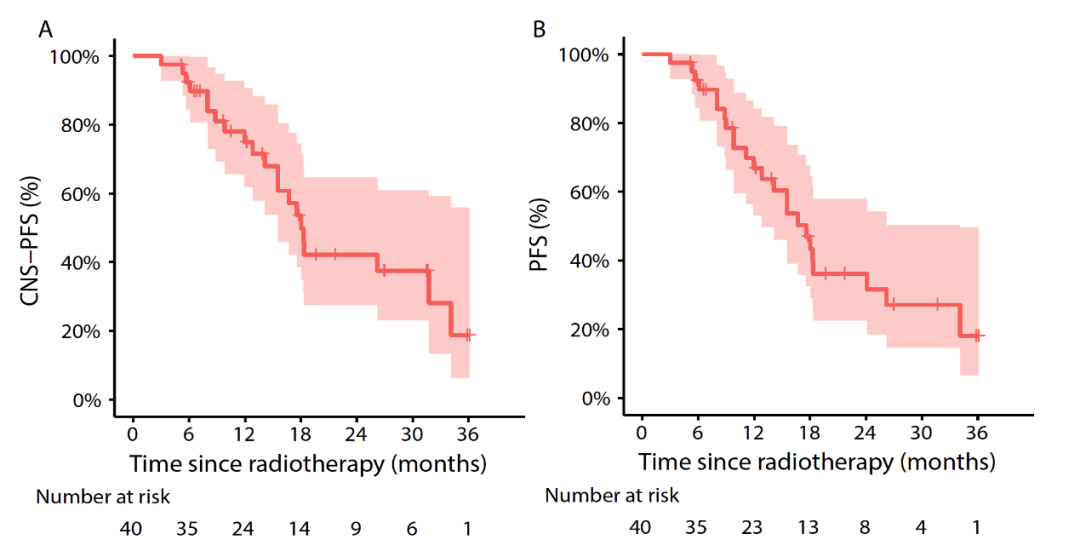 根據患(huan)者個體(ti)情況,最終11例患(huan)者(27.5%)接受了(le)全腦放療(30 Gy/10fx)。29例患(huan)者(72.5%)接受了(le)分次立體(ti)定向放療:32 Gy/4fx(N=20), 24 Gy/3fx(N=6), 40 Gy/5fx(N=3)。