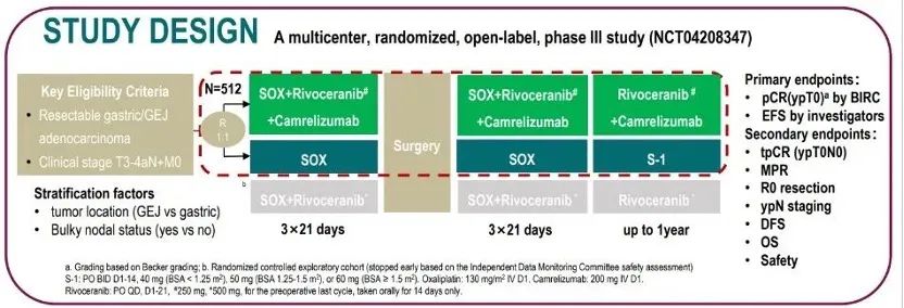 本項(xiang)研究(jiu)計劃招(zhao)募(mu)512例初始可切除(chu)的(de)(de)T3-4aN+M0胃(wei)癌(ai)(ai)(ai)或(huo)胃(wei)食(shi)管(guan)結合(he)部腺癌(ai)(ai)(ai)患(huan)(huan)者(zhe),按1:1的(de)(de)比例隨機分(fen)配(pei)到SOXRC組(zu)(SOX聯(lian)合(he)卡瑞(rui)(rui)利(li)珠(zhu)單抗聯(lian)合(he)阿(a)(a)帕替(ti)(ti)尼(ni))或(huo)SOX組(zu)。根(gen)據原發(fa)灶位置(胃(wei) vs. 胃(wei)食(shi)管(guan)結合(he)部)和(he)Bulky N(是 vs. 否)進行分(fen)層(ceng)。患(huan)(huan)者(zhe)術(shu)(shu)前分(fen)別接(jie)受3個周期(qi)的(de)(de)卡瑞(rui)(rui)利(li)珠(zhu)單抗+阿(a)(a)帕替(ti)(ti)尼(ni)+SOX或(huo)SOX,隨后(hou)進行胃(wei)癌(ai)(ai)(ai)D2根(gen)治(zhi)術(shu)(shu)。術(shu)(shu)后(hou)SOXRC組(zu)接(jie)受3個周期(qi)的(de)(de)卡瑞(rui)(rui)利(li)珠(zhu)單抗+阿(a)(a)帕替(ti)(ti)尼(ni)+SOX,和(he)卡瑞(rui)(rui)利(li)珠(zhu)單抗+阿(a)(a)帕替(ti)(ti)尼(ni)維持(chi)治(zhi)療(卡瑞(rui)(rui)利(li)珠(zhu)單抗術(shu)(shu)前術(shu)(shu)后(hou)最多使(shi)用(yong)17個周期(qi),阿(a)(a)帕替(ti)(ti)尼(ni)術(shu)(shu)前術(shu)(shu)后(hou)總治(zhi)療時(shi)長不超過一年),SOX組(zu)進行3個周期(qi)的(de)(de)SOX,和(he)S-1維持(chi)治(zhi)療(總治(zhi)療時(shi)長不超過一年)。主(zhu)要終點是盲態獨(du)立評(ping)(ping)(ping)審委員會(BIRC)評(ping)(ping)(ping)估的(de)(de)病理(li)完(wan)全(quan)緩(huan)解(pCR)率(ypT0)和(he)研究(jiu)者(zhe)評(ping)(ping)(ping)估的(de)(de)無事件生存期(qi)(EFS),次要終點為tpCR (ypT0N0)、主(zhu)要病理(li)緩(huan)解(MPR)、R0切除(chu)率、ypN分(fen)期(qi)、無病生存期(qi)(DFS)、OS和(he)安(an)全(quan)性。