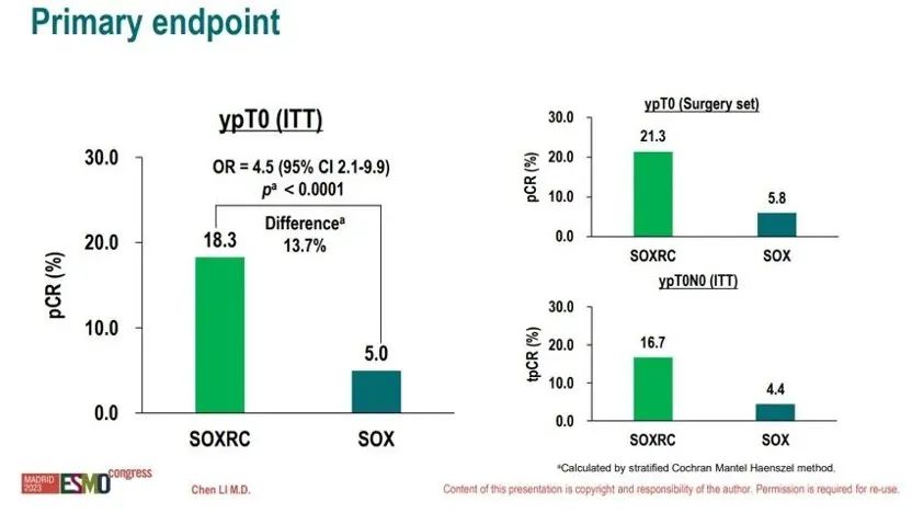 ? 意向治療(ITT)人(ren)群中(zhong)SOXRC組(zu)pCR率(lv)為(wei)18.3%(95% CI 13.0-24.8),較SOX組(zu)5.0%(95% CI 2.3-9.3)顯著(zhu)提(ti)高13.7%(95% CI 7.2-20.1,p<0.0001),具有(you)統(tong)計(ji)學顯著(zhu)差異;SOXRC組(zu)ypT0N0率(lv)為(wei)16.7%,SOX組(zu)為(wei)4.4%;SOXRC組(zu)MPR率(lv)為(wei)51.1%,SOX組(zu)MPR率(lv)為(wei)37.8%;