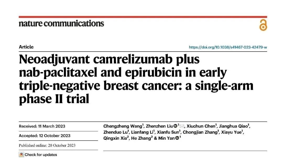 1. Wang C, Liu Z, Chen X, et al. Neoadjuvant camrelizumab plus nab-paclitaxel and epirubicin in early triple-negative breast cancer: a single-arm phase II trial. Nat Commun. 2023 Oct 20;14(1):6654.