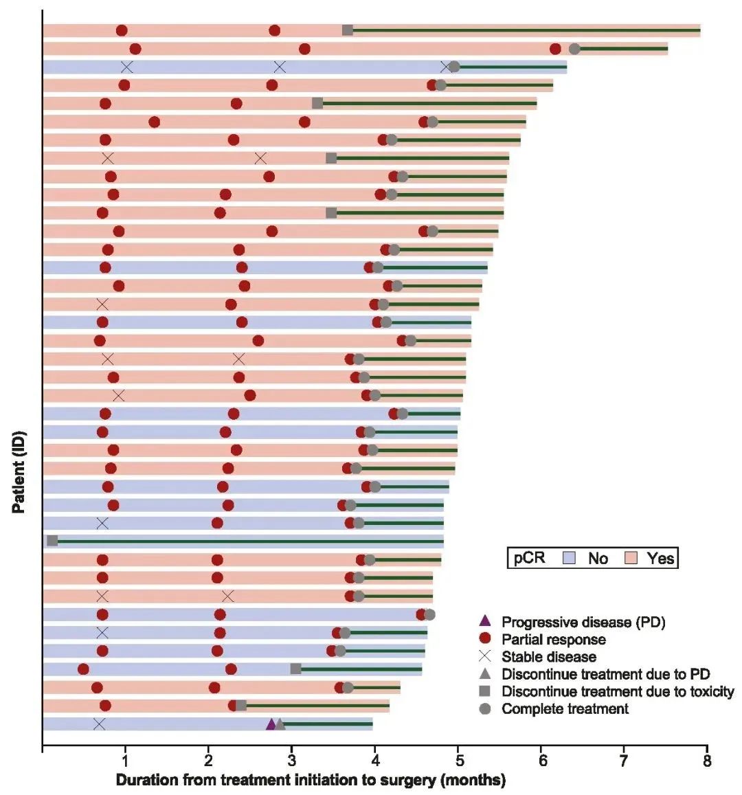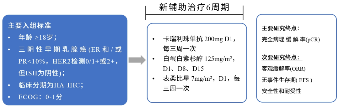 本研(yan)(yan)究(jiu)(jiu)是(shi)一項研(yan)(yan)究(jiu)(jiu)者(zhe)發起的(de)單中心單臂、前瞻性(xing)研(yan)(yan)究(jiu)(jiu)(NCT04213898),主要(yao)入組(zu)標準(zhun)為:1)年齡≥18周歲;2)病理(li)學或組(zu)織細胞學確(que)診為三(san)陰(yin)性(xing)乳腺癌患者(zhe)(ER和/或PR<10%,HER2檢測0/1+,或2+,但免疫組(zu)化ISH為陰(yin)性(xing));3)臨床分期為IIA-IIIC;符合條(tiao)件(jian)的(de)患者(zhe)入組(zu)后接(jie)受卡瑞利珠單抗以及(ji)白蛋白紫杉醇、表柔(rou)比星的(de)治療。主要(yao)研(yan)(yan)究(jiu)(jiu)終點為完(wan)全(quan)病理(li)緩(huan)解(jie)率(pCR),次要(yao)研(yan)(yan)究(jiu)(jiu)終點包括安(an)全(quan)性(xing)、客觀(guan)緩(huan)解(jie)率(ORR),無進展生存期(EFS)等。