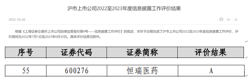 恒瑞醫藥榮獲上交所信息披露考評A級