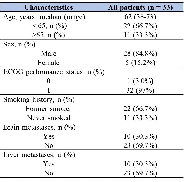 將2020年10月至2023年1月接受阿得(de)貝利(li)單(dan)抗聯合放化(hua)療(liao)治療(liao)的(de)33例(li)(li)ES-SCLC患者(zhe)(zhe)納入研(yan)究分析,中(zhong)位(wei)年齡為(wei)62歲(sui)(38-73歲(sui)),其中(zhong),28例(li)(li)患者(zhe)(zhe)為(wei)男性(84.8%),22例(li)(li)患者(zhe)(zhe)具有吸煙史(66.7%),32例(li)(li)患者(zhe)(zhe)ECOG PS評分為(wei)1(97%)。基線時(shi),10例(li)(li)患者(zhe)(zhe)存在腦轉(zhuan)移(30.3%),10例(li)(li)患者(zhe)(zhe)存在肝轉(zhuan)移(30.3%)。