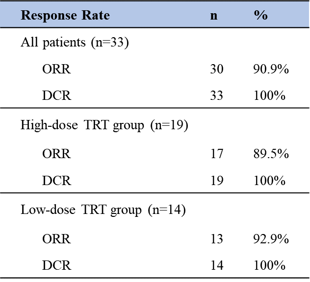 在33例患(huan)(huan)者(zhe)(zhe)中,19例患(huan)(huan)者(zhe)(zhe)接(jie)受(shou)高劑(ji)(ji)量(liang)TRT(>3Gy*10f或(huo)≥2Gy*25f),14例患(huan)(huan)者(zhe)(zhe)接(jie)受(shou)低劑(ji)(ji)量(liang)TRT(≤3Gy*10f或(huo)<2Gy*25f)。阿得(de)貝(bei)利單抗聯(lian)合化療(liao)序貫(guan)胸部放療(liao)一線治療(liao)廣泛期小(xiao)細胞肺(fei)癌患(huan)(huan)者(zhe)(zhe)顯(xian)示出良好的數(shu)據:ORR達(da)90.9%,這(zhe)意味著(zhu)10個(ge)ES-SCLC患(huan)(huan)者(zhe)(zhe)中就有9個(ge)患(huan)(huan)者(zhe)(zhe)可以獲得(de)疾病(bing)客觀緩解。DCR達(da)100%。根(gen)據目(mu)前公布的研究數(shu)據,接(jie)受(shou)高劑(ji)(ji)量(liang)TRT組的患(huan)(huan)者(zhe)(zhe)和接(jie)受(shou)低劑(ji)(ji)量(liang)TRT組的患(huan)(huan)者(zhe)(zhe)療(liao)效上沒有顯(xian)著(zhu)差異,ORR分(fen)別為89.5%和92.9%;DCR都(dou)可達(da)100%。
