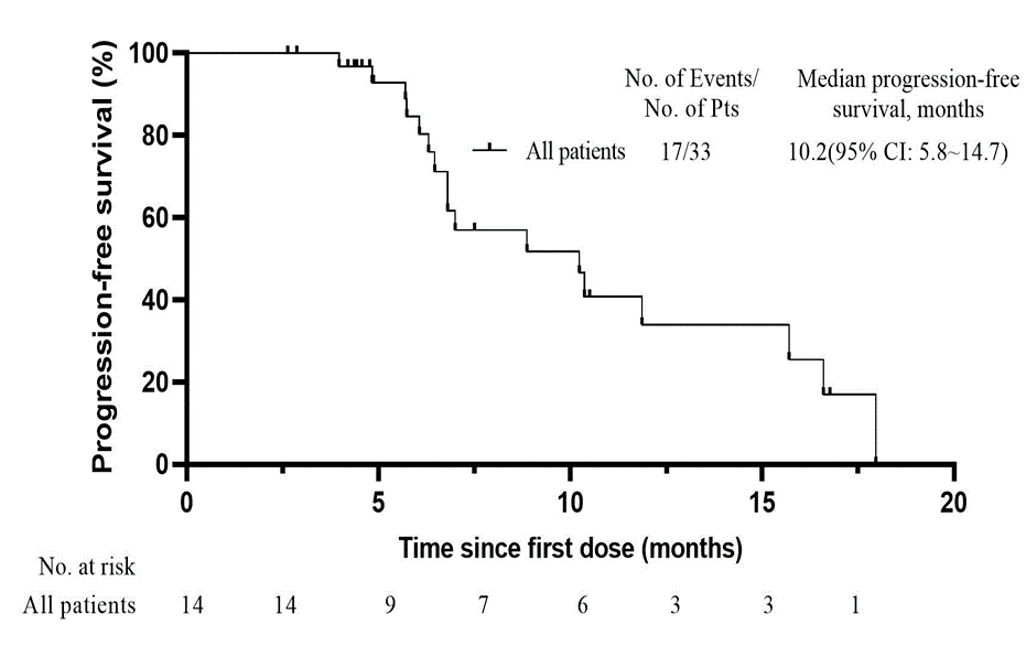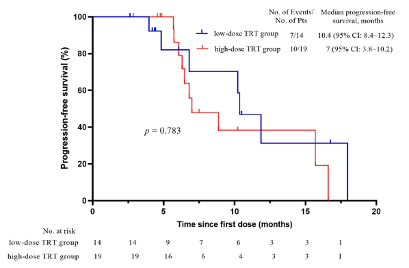 中位(wei)隨(sui)訪時(shi)間13個月(yue),研究結果顯示,17例患者出現(xian)疾病進展,中位(wei)PFS達10.2個月(yue)(95% CI:5.8-14.7);高(gao)劑(ji)(ji)量TRT(>3Gy*10f或≥2Gy*25f)組(zu)中位(wei)PFS為7個月(yue),低劑(ji)(ji)量TRT(≤3Gy*10f或<2Gy*25f)組(zu)中位(wei)PFS高(gao)達10.4個月(yue),提(ti)示低劑(ji)(ji)量TRT聯合免疫治療可能為ES-SCLC患者帶來(lai)進一(yi)步獲(huo)益的(de)趨勢,但仍(reng)然需要大型Ⅲ期臨床(chuang)研究進一(yi)步驗證。