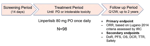 主要終(zhong)點為(wei)(wei)客觀緩(huan)解率(lv)ORR(獨立審查委員(yuan)會根據Lugano2014標準評估(gu)),次要終(zhong)點為(wei)(wei)緩(huan)解持(chi)續時間(DoR),無進展(zhan)生(sheng)存(cun)期(PFS),總生(sheng)存(cun)期(OS),疾病(bing)控制(zhi)率(lv)(DCR),至緩(huan)解時間(TTR)及安全性。