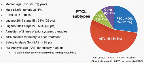 這是一(yi)項開(kai)放標簽、2期(qi)注(zhu)冊(ce)研(yan)究(NCTO4705090),2021年5月至2022年10月,中國25家(jia)研(yan)究中心共(gong)入組98例患者。關鍵入選(xuan)標準:1)年齡≥18歲,男女不(bu)(bu)限;2)經(jing)病(bing)(bing)理證實(shi)的(de)PTCL,包括但不(bu)(bu)限于(yu):PTCL非特指型(xing)(PTCL-NOS)、血管免疫母細胞(bao)(bao)(bao)性(xing)(xing)T細胞(bao)(bao)(bao)淋(lin)(lin)(lin)(lin)巴瘤(liu)(AITL)、ALK陽性(xing)(xing)或(huo)陰性(xing)(xing)間變性(xing)(xing)大細胞(bao)(bao)(bao)淋(lin)(lin)(lin)(lin)巴瘤(liu)(ALCL)、NK/T細胞(bao)(bao)(bao)淋(lin)(lin)(lin)(lin)巴瘤(liu)(NKTCL)、肝脾T細胞(bao)(bao)(bao)淋(lin)(lin)(lin)(lin)巴瘤(liu)(HSTCL)、腸病(bing)(bing)相(xiang)關T細胞(bao)(bao)(bao)淋(lin)(lin)(lin)(lin)巴瘤(liu)(EATL)等;3)經(jing)過至少一(yi)次PTCL全身系統(tong)性(xing)(xing)治(zhi)(zhi)療(liao)失敗或(huo)不(bu)(bu)能耐受的(de)PTCL全身治(zhi)(zhi)療(liao);4)對于(yu)復發難治(zhi)(zhi)性(xing)(xing)ALCL,需要包括抗(kang)CD30單克隆(long)抗(kang)體(BV)在內的(de)既(ji)往治(zhi)(zhi)療(liao),NKTCL以門(men)冬酰胺酶為(wei)基(ji)礎的(de)方案治(zhi)(zhi)療(liao);5)ECOG評分(fen)0-1;6)至少有(you)一(yi)個(ge)可測量的(de)靶病(bing)(bing)灶(Lugano2014標準);7)充足的(de)器官功能。林普(pu)利(li)塞以80 mg QD(RP2D)連(lian)續口服給藥(yao),直至疾(ji)病(bing)(bing)進展、不(bu)(bu)可耐受的(de)毒性(xing)(xing)或(huo)退出研(yan)究。