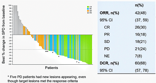 本研(yan)究達(da)(da)到(dao)(dao)了主要終(zhong)點,FAS集的總(zong)緩(huan)解率(lv)(ORR)為48%,26例患者(30%)達(da)(da)到(dao)(dao)完全緩(huan)解(CR),16例患者(18%)部(bu)分緩(huan)解(PR),還有18例患者(20%)達(da)(da)到(dao)(dao)疾(ji)病(bing)穩定(SD),疾(ji)病(bing)控制率(lv)(DCR)為68%。