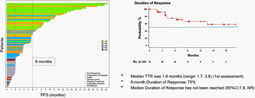 首次評估的中(zhong)位(wei)TTR為(wei)(wei)1.9個(ge)月(yue)(范圍:1.7-3.8個(ge)月(yue)),6個(ge)月(yue)DoR為(wei)(wei)75%,中(zhong)位(wei)DoR未達(da)到(95% CI:7.8-NR)。