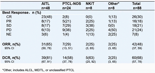 在PTCL各(ge)亞(ya)型中,AITL、PTCL-NOS、NK/T患(huan)者ORR分別為(wei)65%、29%、25%,在AITL、PTCL-NOS、NK/T患(huan)者中DCR分別為(wei)81%、58%、63%。