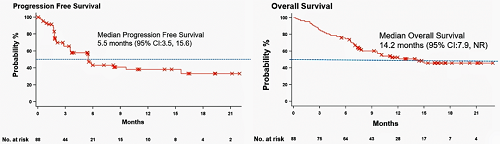 截至2023年(nian)4月(yue)24日,中位隨(sui)訪14.8個(ge)(ge)月(yue)時,中位PFS為(wei)5.5個(ge)(ge)月(yue)(95% CI: 3.5-15.6),6個(ge)(ge)月(yue)總生存(OS)率為(wei)75%(95% CI: 64.51%-82.74%),中位OS為(wei)14.2個(ge)(ge)月(yue)(95% CI: 7.9-NR)。中位DoR未達到(95% CI:7.8-NR)。