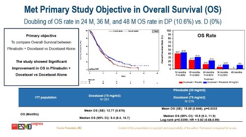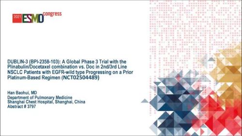 DUBLIN-3是(shi)一項國際(ji)多中心、III 期、隨機(ji)對(dui)照臨床研究,旨在評估(gu)普那布林聯合多西(xi)他(ta)賽對(dui)比單(dan)藥(yao)多西(xi)他(ta)賽在EGFR野生(sheng)型(xing)NSCLC二/三線治療中的(de)安全性和有效性。研究在全球(qiu)共納入559例受(shou)試者,按1:1隨機(ji)分組,兩(liang)組受(shou)試者均在每(mei)個化(hua)療周期(21天(tian)(tian))的(de)第(di)1天(tian)(tian)接受(shou)75 mg/㎡多西(xi)他(ta)賽給藥(yao),聯合治療組在第(di)1天(tian)(tian)多西(xi)他(ta)賽給藥(yao)后1小時和第(di)8天(tian)(tian)給予30 mg/㎡普那布林。研究的(de)主要終(zhong)點(dian)為OS,次要終(zhong)點(dian)包括(kuo):ORR、PFS、4級中性粒細胞減少癥(zheng)的(de)發(fa)生(sheng)率、24個月(yue) OS 率、36 個月(yue)OS率、48個月(yue)OS率等。