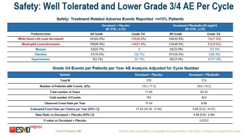 平均PFS為6.0個月(yue)(yue)vs 4.4個月(yue)(yue),中位(wei)PFS為3.6個月(yue)(yue)vs 3.0個月(yue)(yue),ORR為12.23% vs 6.76%,4級中性粒細胞減(jian)少(shao)癥的發生(sheng)率顯著下降(jiang)(第(di)一療程第(di)8天(tian):27.8% vs 5.26%;全部療程第(di)8天(tian):33.58% vs 5.13%)。
