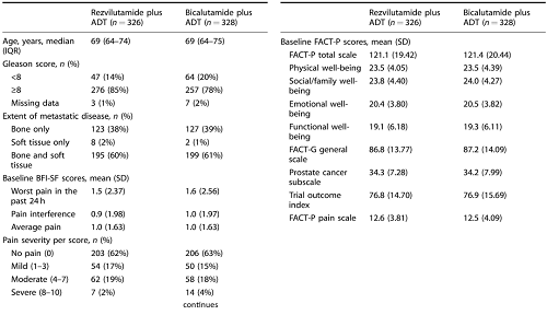 在整個研究中,BPI-SF和(he)(he)(he)FACT-P的患(huan)者(zhe)依從性很高,在第161周(zhou)之前,兩個治療組(zu)(zu)的依從性均超過(guo)90%。只有(you)25例患(huan)者(zhe)(3.8%)錯過(guo)三次或更多計(ji)劃的疼痛評(ping)估(gu)。基(ji)線評(ping)估(gu)顯示兩組(zu)(zu)的疼痛水平較低(di),瑞維(wei)魯胺+ADT組(zu)(zu)中有(you)203例(62%)患(huan)者(zhe)、對照組(zu)(zu)中有(you)206例(63%)患(huan)者(zhe)在基(ji)線時報告無(wu)疼痛,僅分別有(you)17%和(he)(he)(he)15%的患(huan)者(zhe)報告輕度疼痛。基(ji)線FACT-P評(ping)分表明,瑞維(wei)魯胺+ADT組(zu)(zu)和(he)(he)(he)對照組(zu)(zu)的功能狀態相似。