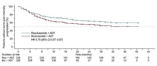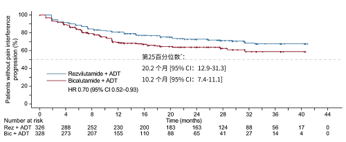 瑞維(wei)魯胺(an)+ADT組中位(wei)至疼痛干預時(shi)間更長(chang)(NR[95% CI:NR-NR]與NR[95% CI:NR-NR];第(di)25百(bai)分位(wei)數:20.2個月[95% CI:12.9-31.3]與10.2個月[95% CI:7.4-11.1];HR=0.70[95% CI:0.52-0.93];p=0.015,圖(tu)3)。