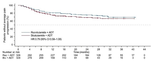 兩組均(jun)未達中位至平均(jun)疼痛進(jin)展時間(jian),其中瑞維魯胺+ADT組的第(di)25百分位數為(wei)25.8個月(95% CI:14.8-31.4),而對照組為(wei)11.7個月(95% CI:8.7-22.1;HR=0.79[95% CI:0.58-1.08];p=0.133;圖4)。