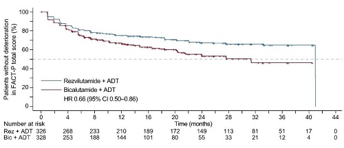 對于FACT-P總分,瑞維魯胺+ADT組(zu)(zu)在功能惡(e)化的(de)第25百分位數時間更長(12.8個(ge)月(yue)(yue)[95% CI:7.4-20.3],而對照組(zu)(zu)為6.0個(ge)月(yue)(yue)[95% CI:4.6-9.2];HR=0.66[95% CI:0.50-0.86];p=0.002;圖6,表2)。