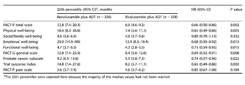 幾乎所有FACT-P子(zi)量(liang)(liang)表的惡化(hua)在瑞(rui)維魯胺+ADT治療下均延(yan)遲,包(bao)括身(shen)體功能(HR=0.65,95% CI:0.49-0.86;p=0.003)、情緒(xu)功能(HR=0.68,95% CI:0.50-0.92;p=0.013)、功能狀態(tai)(HR=0.75,95% CI:0.59-0.95;p=0.015)、FACT-G總體量(liang)(liang)表(HR=0.69,95% CI:0.52-0.91;p=0.008)、前列腺癌(ai)子(zi)量(liang)(liang)表(HR=0.74,95% CI:0.57-96;p=0.022)和(he)試驗(yan)結局指數(HR=0.65,95% CI:0.49-0.86;p=0.002;表2)。但是,兩組(zu)在社會/家庭功能惡化(hua)時(shi)間或FACT-P疼痛量(liang)(liang)表方面未(wei)發現差異。