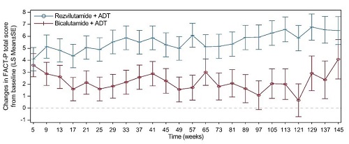 兩組在所有(you)(you)時間點的FACT-P總分均(jun)較基(ji)線有(you)(you)所改善(最小(xiao)二乘法[LS]均(jun)值為(wei)0.66-6.77;圖7),瑞(rui)維魯(lu)胺(an)+ADT組的改善更為(wei)明顯,組間LS均(jun)值差異為(wei)0.50-5.20。