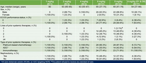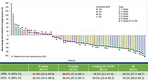 共納(na)入81例尿路上(shang)皮癌患者(6和(he)8mg/kg劑量(liang)組(zu)中位年(nian)齡:65歲);30%以上(shang)的患者接(jie)受過(guo)(guo)≥2線既(ji)往系統治療,既(ji)往接(jie)受過(guo)(guo)Her2 ADC治療比例超過(guo)(guo)35%。