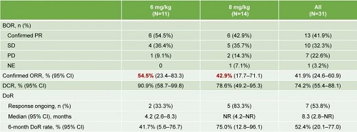 31例患(huan)(huan)者在研究治療(liao)前接(jie)受過Her2 ADC治療(liao),其中41.9%(13例)的患(huan)(huan)者有達到確認(ren)的部分(fen)緩解(PR)。在接(jie)受過Her2 ADC治療(liao)的患(huan)(huan)者中,6mg/kg劑(ji)量組確認(ren)的ORR為54.5%(95% Cl:23.4-83.3),8mg/kg劑(ji)量組確認(ren)的ORR為42.9%(95% Cl:17.7-71.1)。