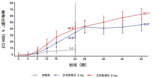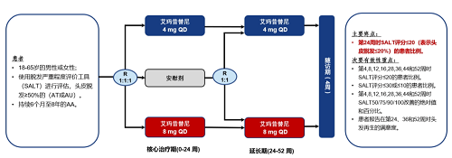 在(zai)核心期治(zhi)療中,試驗組(zu)使用(yong)硫(liu)酸艾瑪(ma)昔(xi)(xi)替(ti)尼片(pian)4 mg/8 mg治(zhi)療,安(an)慰劑組(zu)使用(yong)安(an)慰劑治(zhi)療。在(zai)24周(zhou)之后至52周(zhou)均使用(yong)硫(liu)酸艾瑪(ma)昔(xi)(xi)替(ti)尼片(pian)維持治(zhi)療。研究的(de)主要(yao)終點是評(ping)(ping)價(jia)24周(zhou)時(shi)SALT評(ping)(ping)分≤20(表(biao)示頭皮脫發≤20%)的(de)患者比例。