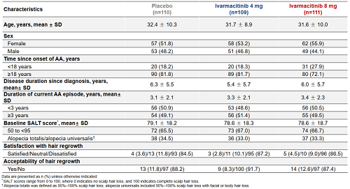 研究(jiu)共納(na)入(ru)330例重(zhong)度斑(ban)禿患者,硫酸艾(ai)瑪(ma)昔替(ti)尼(ni)片4 mg/8 mg和安慰劑組基線平均SALT評(ping)分(fen)分(fen)別為78.6、78.6和79.1。