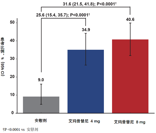 研究主要終(zhong)點的(de)結(jie)果顯示,在(zai)第24周時硫酸艾瑪昔替尼片4 mg/8 mg和(he)安慰劑(ji)組的(de)SALT評(ping)分(fen)≤20的(de)患者比例分(fen)別(bie)為34.9%、40.6%和(he)9%,與(yu)安慰劑(ji)組相比,4 mg組和(he)8 mg組的(de)應答率(lv)差異分(fen)別(bie)為25.6%(95% CI:15.4-35.7,雙側(ce)p<0.0001)和(he)31.6%(95% CI:21.5-41.8,雙側(ce)p<0.0001)(圖2)。
