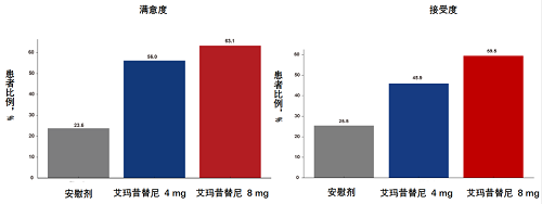 在(zai)治療核(he)心期和延長期間,達(da)到SALT評分≤20的(de)(de)患者(zhe)比例持(chi)(chi)續增加,在(zai)第(di)52周時硫酸(suan)艾瑪昔替尼片4 mg和8 mg組分別達(da)到了46.8%和63.1%(圖3),患者(zhe)的(de)(de)SALT評分絕對值與(yu)百分比持(chi)(chi)續降低(圖4)。隨(sui)著癥狀的(de)(de)改善(shan),患者(zhe)對于(yu)頭發再(zai)生的(de)(de)滿意度與(yu)接(jie)受度也(ye)顯著高于(yu)安慰劑組(圖5)。
