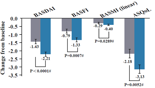 第12周時,其他健康結果及脊柱活動能力指標BASDAI、BASFI、BASMI、ASQoL、SF-36 PCS和SF-36 MCS較基線變化均較接受安慰劑治療的受試者有改善。(圖2和圖3)