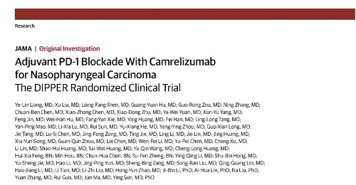 DIPPER研究是一項評估卡瑞利珠單抗輔助治療高危局部晚期鼻咽癌的開放標簽、隨機、對照、Ⅲ期臨床研究,由中山大學腫瘤防治中心馬駿院士、孫穎教授團隊牽頭開展。繼2024年美國臨床腫瘤學會(ASCO)年會中以口頭報告的形式(摘要號:LBA 6000)公布了研究結果后[1],近日全文發表于《美國醫學會雜志》(JAMA,IF:63.1)主刊[2]。