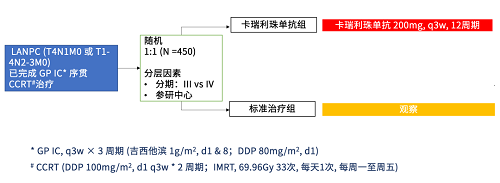DIPPER研究[1,2]是一項開放標簽的隨機、對照、Ⅲ期臨床研究。研究入組局部晚期的鼻咽癌患者(T4N1M0、T1-4N2-3M0,AJCC V8),在接受3個周期GP誘導化療(吉西他濱:1000mg/m2,D1,8,Q3W;順(shun)鉑(bo):80mg/m2 D1,Q3W)序貫根(gen)治性(xing)(xing)同(tong)步放化(hua)療(IMRT,66.96Gy,33f;順(shun)鉑(bo)100mg/m2;Q3W,2周期(qi))之后,按照1:1的比(bi)例隨(sui)機,試驗組接受卡瑞利珠單抗(200mg,D1,Q3W)單藥治療共(gong)12個(ge)周期(qi),對照組則進入(ru)隨(sui)訪觀察。研究的主要(yao)終點(dian)為無事件生存(EFS),次要(yao)研究終點(dian)包括無遠處復發生存(DMFS)、無區(qu)域復發生存(LRRFS)、總生存(OS)、患者報告結局(PRO)和(he)安全性(xing)(xing)。