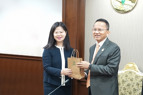 馮(feng)佶女士向(xiang)泰(tai)國公共(gong)衛生部部長(chang)頌薩·貼素(su)汀先生贈送禮品(pin)