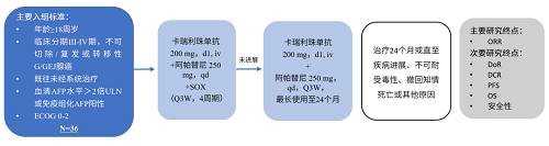 本研究是一項單(dan)臂、II期、多(duo)中心(xin)臨床試驗(yan)(NCT04609176),旨在評估卡瑞利珠單(dan)抗(kang)聯(lian)合(he)阿帕替尼(ni)和(he)SOX一線(xian)治療產甲胎蛋白(bai)胃(wei)/胃(wei)食管結合(he)部腺癌患(huan)者(zhe)的抗(kang)腫瘤活性、安(an)全性及生物標志物變化。主要(yao)終(zhong)點是基于RECIST v1.1確認的ORR。次(ci)要(yao)終(zhong)點包括DCR、PFS、OS、緩解持續時間、緩解時間及安(an)全性等。