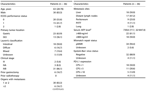 2020年12月4日至2023年8月4日期間,研究共納入(ru)36例(li)患(huan)者。其中(zhong)30例(li)患(huan)者(83.3%)為男性(xing)。大多數患(huan)者臨床(chuang)分期為IVB期(n=31,86.1%)。18例(li)患(huan)者(50.0%)伴有(you)肝轉(zhuan)移(yi),17例(li)(47.2%)伴有(you)遠(yuan)處淋巴結轉(zhuan)移(yi),9例(li)(25.0%)伴有(you)腹膜(mo)轉(zhuan)移(yi)。中(zhong)位血清AFP水平為739.8ng/ml(范圍:77.7-321847.0)。