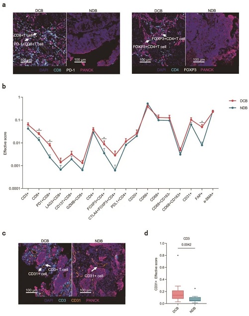 圖(tu)3. DCB組(zu)和NDB組(zu)的腫瘤浸(jin)潤細胞總體景觀和密度比較
