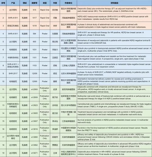 在(zai)乳腺(xian)癌領域,吡咯替(ti)尼(ni)(ni)、達爾西利(li)(li)、卡瑞(rui)利(li)(li)珠單(dan)(dan)抗、阿帕替(ti)尼(ni)(ni)、阿得(de)貝利(li)(li)單(dan)(dan)抗、瑞(rui)康曲(qu)妥珠單(dan)(dan)抗(SHR-A1811)、SHR-2017,或(huo)產(chan)品(pin)間聯(lian)合或(huo)聯(lian)合化療,共有19項(xiang)研究入(ru)(ru)選(包括3項(xiang)快速(su)口頭報道和7項(xiang)壁報展(zhan)示(shi)以及(ji)9項(xiang)線(xian)上發(fa)表)。其中吡咯替(ti)尼(ni)(ni)占據7項(xiang)、達爾西利(li)(li)占據6項(xiang),持續發(fa)力展(zhan)現令人鼓(gu)舞的療效;而(er)瑞(rui)康曲(qu)妥珠單(dan)(dan)抗(SHR-A1811)、阿得(de)貝利(li)(li)單(dan)(dan)抗等(deng)藥(yao)物相關研究入(ru)(ru)選快速(su)口頭報告,獲得(de)業內廣泛關注。