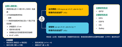 達爾西利(Dalpiciclib)是恒瑞醫藥自主研發的口服、選擇性的小分子CDK4/6抑制劑,也是中國首個自主研發的新型高選擇性 CDK4/6 抑制劑,已證實其與內分泌治療(ET)聯合用于 HR+/HER2- 晚期乳腺癌的一線和后線治療時,均顯著改善無進展生存期(PFS)6,7。因此開(kai)展(zhan)了一(yi)項隨機(ji)、雙盲(mang)、III期臨床試驗(DAWNA-A),以進(jin)一(yi)步評估達爾西(xi)利聯合內分泌(mi)治療(liao)作為(wei)高(gao)危早期 HR+/HER2 - 乳(ru)腺癌(ai)輔助(zhu)治療(liao)的效(xiao)果(guo)。本(ben)研究(jiu)納入高(gao)危復發風(feng)險人群(qun)需滿足以下標準之(zhi)一(yi):①≥4 枚陽(yang)(yang)性腋(ye)窩淋(lin)巴結;②1–3枚陽(yang)(yang)性腋(ye)窩淋(lin)巴結且合并≥1 項高(gao)危因素(腫瘤直徑 ≥5 cm,組(zu)織學分級(ji)3級(ji),輔助(zhu)治療(liao)后殘(can)留浸潤性乳(ru)腺癌(ai),Ki-67 ≥30%)。本(ben)文呈現預先設定的首(shou)次中期分析(IA1)結果(guo)。