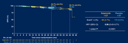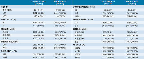研究(jiu)納(na)入(ru)了年(nian)(nian)齡在18-75歲、II-III期(qi)HR+/HER2-乳腺癌患(huan)(huan)者(zhe),這些患(huan)(huan)者(zhe)已完(wan)成根治性(xing)局部治療(liao)(liao)(手術和/或放療(liao)(liao)),且經(jing)(jing)病(bing)理證實存(cun)在同側(ce)(ce)腋(ye)窩淋(lin)巴結(jie)受(shou)累。患(huan)(huan)者(zhe)按1:1隨機(ji)分組,接(jie)受(shou)口服達爾(er)西利(125 mg,每日1次(ci),連續服藥3周、停(ting)藥1周,療(liao)(liao)程2年(nian)(nian))聯(lian)合(he)內分泌治療(liao)(liao)(來曲(qu)唑2.5 mg/阿那曲(qu)唑1 mg/他莫(mo)昔(xi)芬10 mg/托(tuo)瑞米(mi)芬60 mg,每日1次(ci),療(liao)(liao)程5年(nian)(nian))或安慰劑(ji)聯(lian)合(he)內分泌治療(liao)(liao)。絕(jue)經(jing)(jing)前/圍絕(jue)經(jing)(jing)期(qi)患(huan)(huan)者(zhe)接(jie)受(shou)LHRH激動劑(ji)治療(liao)(liao)(圍絕(jue)經(jing)(jing)期(qi)患(huan)(huan)者(zhe)是否(fou)使用(yong)由研究(jiu)者(zhe)決(jue)定)。分層因素包括絕(jue)經(jing)(jing)狀(zhuang)態(絕(jue)經(jing)(jing)前/圍絕(jue)經(jing)(jing)期(qi) vs 絕(jue)經(jing)(jing)后(hou))、臨床分期(qi)(II期(qi) vs III期(qi))、受(shou)累淋(lin)巴結(jie)數目(<4枚 vs ≥4枚)和輔助化療(liao)(liao)史(是 vs 否(fou))。主要終(zhong)點為無浸潤性(xing)疾(ji)病(bing)生(sheng)(sheng)存(cun)期(qi)(iDFS)。首次(ci)中期(qi)分析(xi)(IA1)預先計(ji)劃在約(yue)254例iDFS事件(jian)發生(sheng)(sheng)時(shi)(約(yue)為預期(qi)總事件(jian)數的50%)進行。截至2024年(nian)(nian)10月25日,發生(sheng)(sheng)268例iDFS事件(jian)并完(wan)成IA1分析(xi);實際優效性(xing)界值為單(dan)側(ce)(ce)P<0.00205(采用(yong)Lan-DeMets[O’Brien-Fleming]邊界法)。
