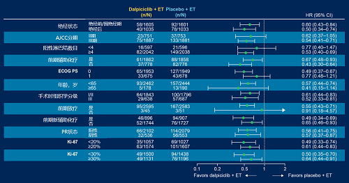 與安慰劑聯合(he)內分泌治療(ET)相(xiang)比(bi),達爾(er)(er)(er)西利(li)(Dalp)聯合(he)ET顯著延(yan)長(chang)了(le)無浸潤性疾病(bing)(bing)生(sheng)存期(qi)(iDFS)(HR 0.56,95% CI 0.43–0.71;單側P<0.0001),且在2年時帶來4.5%的絕對iDFS獲益。達爾(er)(er)(er)西利(li)帶來的iDFS獲益在各分層因(yin)素和(he)其他基線亞(ya)組(zu)中總(zong)體(ti)一致。無病(bing)(bing)生(sheng)存期(qi)(DFS)和(he)無遠處病(bing)(bing)生(sheng)存期(qi)(DDFS)也顯示達爾(er)(er)(er)西利(li)聯合(he)ET優于安慰劑聯合(he)ET。安全性方面(mian),達爾(er)(er)(er)西利(li)安全性整體(ti)可控。