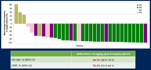 本研究(jiu)為一項開放(fang)、劑量(liang)探索和(he)臨(lin)床拓展的Ib/II期臨(lin)床試驗,旨在(zai)評估SHR-A1912聯(lian)合化療在(zai)初治(zhi)或復(fu)(fu)發(fa)(fa)難(nan)治(zhi)DLBCL患者中的安(an)全性和(he)有效性。本次ASCO公布的是(shi)SHR-A1912聯(lian)合R-GemOx治(zhi)療復(fu)(fu)發(fa)(fa)難(nan)治(zhi)DLBCL隊列的研究(jiu)結果。