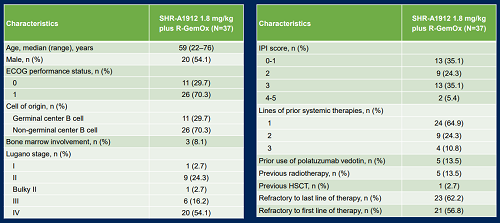 共(gong)有(you)37例復發難(nan)(nan)治(zhi)(zhi)DLBCL患者(zhe)接受(shou)(shou)了SHR-A1912 1.8 mg/kg聯合R-GemOx治(zhi)(zhi)療(liao)。其(qi)中,62.2%的受(shou)(shou)試者(zhe)對(dui)上(shang)一線(xian)治(zhi)(zhi)療(liao)難(nan)(nan)治(zhi)(zhi),56.8%的受(shou)(shou)試者(zhe)為原發難(nan)(nan)治(zhi)(zhi)(表(biao)1)。