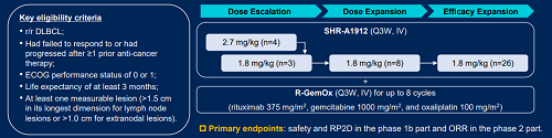 該(gai)研(yan)究包(bao)括劑(ji)量(liang)遞增和(he)劑(ji)量(liang)擴(kuo)展Ib期(qi)階(jie)段以及療(liao)(liao)效拓展II期(qi)階(jie)段。復發難治(zhi)隊列(lie)納入既(ji)往接受過(guo)≥1線治(zhi)療(liao)(liao)的(de)(de)DLBCL患者(zhe),要求(qiu)基線ECOG 體能狀態評分為0-1,并具有可(ke)測量(liang)的(de)(de)病(bing)灶。患者(zhe)接受SHR-A1912聯合R-GemOx方(fang)案(每3周一次,靜脈給藥)至多8個周期(qi)后,接受SHR-A1912單藥維持治(zhi)療(liao)(liao)。Ib期(qi)階(jie)段的(de)(de)主(zhu)要終點(dian)為安全性和(he)II期(qi)研(yan)究推薦劑(ji)量(liang)(RP2D),II期(qi)階(jie)段的(de)(de)主(zhu)要終點(dian)為客觀(guan)緩解率(lv)(ORR)。