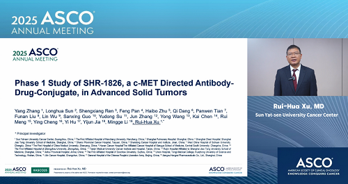 2025年美國臨床腫瘤學會(ASCO)年會于5月30日至6月3日在美國芝加哥舉行。本次大會,由中山大學腫瘤防治中心徐瑞華教授牽頭、恒瑞自主研發的靶向細胞間質上皮轉換因子(c-MET)ADC藥物SHR-1826的一項I期臨床研究入選臨床科學研討會,并由徐瑞華教授口頭報告了該研究結果。該研究由43家國內中心共同完成。初步結果顯示,SHR-1826在晚期實體瘤患者中安全性可控,在非小細胞肺癌(NSCLC)患者中展示出顯著抗腫瘤活性,有望為MET異常患者群體提供新的治療方案1。