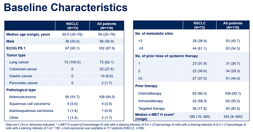 研究共納入116例受試(shi)者,其中(zhong)NSCLC受試(shi)者72例。44%的受試(shi)者既往(wang)接受過≥3線的系統性(xing)抗腫瘤治療。