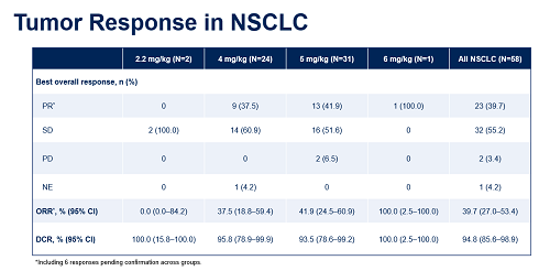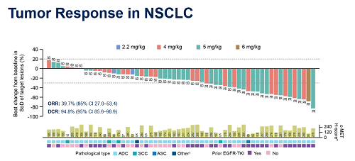 在(zai)(zai)58例可評估的NSCLC患(huan)(huan)者中,客觀緩解(jie)率(ORR)達(da)39.7%,疾病(bing)控制率(DCR)達(da)94.8%,自4 mg/kg、5 mg/kg、6 mg/kg均出現腫瘤緩解(jie)。療效(xiao)覆蓋不同c-MET表達(da)水平患(huan)(huan)者。且在(zai)(zai)既往(wang)使用(yong)或未(wei)使用(yong)過EGFR-TKI的NSCLC患(huan)(huan)者中,均可觀察(cha)到(dao)療效(xiao)獲益。