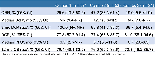 在聯(lian)合(he)(he)隊(dui)(dui)列(lie)(lie)2(SHR-8068 4 mg/kg單劑聯(lian)合(he)(he)阿得貝利單抗和(he)(he)貝伐珠單抗)中(zhong),研究者基于(yu)RECIST v1.1評估的(de)ORR為47.2%(25/53;95% CI 33.3-61.4%),中(zhong)位(wei)DoR為12.7個月(yue)(95% CI 5.8-NR),中(zhong)位(wei)PFS達到8.7個月(yue)(95% CI 5.5-11.6)。數值上,聯(lian)合(he)(he)隊(dui)(dui)列(lie)(lie)2的(de)ORR和(he)(he)生存結果均高于(yu)聯(lian)合(he)(he)隊(dui)(dui)列(lie)(lie)1和(he)(he)聯(lian)合(he)(he)隊(dui)(dui)列(lie)(lie)3。
