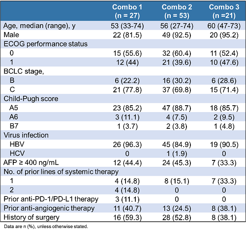 在聯合(he)隊列(lie)(lie)1、2和3中(zhong),受(shou)(shou)試(shi)者(zhe)的中(zhong)位年齡分(fen)(fen)別為53、56和60歲(sui),大部分(fen)(fen)受(shou)(shou)試(shi)者(zhe)存在乙型肝炎病毒(HBV)感染,大部分(fen)(fen)受(shou)(shou)試(shi)者(zhe)的BCLC分(fen)(fen)期(qi)為C期(qi)。聯合(he)對列(lie)(lie)1中(zhong),3例(li)(11.1%)受(shou)(shou)試(shi)者(zhe)既往接(jie)受(shou)(shou)過抗(kang)PD-1/PD-L1抗(kang)體治療,11例(li)(40.7%)受(shou)(shou)試(shi)者(zhe)既往接(jie)受(shou)(shou)過抗(kang)血(xue)(xue)管(guan)生(sheng)成藥(yao)物治療。聯合(he)隊列(lie)(lie)2中(zhong),13例(li)(24.5%)受(shou)(shou)試(shi)者(zhe)既往接(jie)受(shou)(shou)過抗(kang)血(xue)(xue)管(guan)生(sheng)成藥(yao)物治療。聯合(he)隊列(lie)(lie)3中(zhong),8例(li)(38.1%)受(shou)(shou)試(shi)者(zhe)既往接(jie)受(shou)(shou)過抗(kang)血(xue)(xue)管(guan)生(sheng)成藥(yao)物治療。研究納入的晚期(qi)HCC患者(zhe)符(fu)合(he)中(zhong)國肝癌(ai)人群(qun)特征。