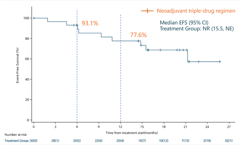 本研究(jiu)12個(ge)月EFS率達77.6%(95% CI:56.7%-89.3%),中(zhong)(zhong)位EFS尚未達到。在Ⅱ期患(huan)者(zhe)(zhe)中(zhong)(zhong),其研究(jiu)者(zhe)(zhe)(INV)評(ping)(ping)估(gu)(gu)的中(zhong)(zhong)位EFS尚未達到(95% CI:10.8-NE);在Ⅲ期患(huan)者(zhe)(zhe)中(zhong)(zhong),其INV評(ping)(ping)估(gu)(gu)的中(zhong)(zhong)位EFS為21.3個(ge)月(95% CI:9.3-NE)。